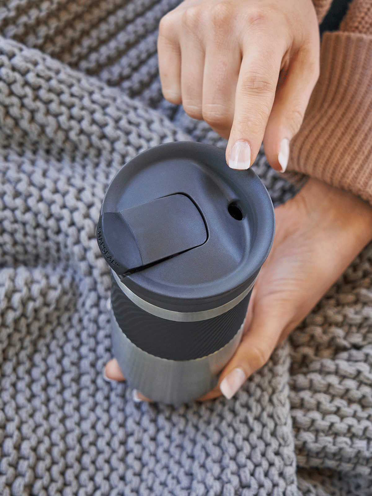 Mugs Byron ont un capuchon innovant avec le système SnapSeal, qui permet d'ouvrir et de fermer facilement l'embout d'une seule main. Vous faites glisser le bouchon vers le haut avec un doigt et vous pouvez boire votre café ou votre thé confortablement. Vous rabattez le bouton et le gobelet retrouve son étanchéité à 100 %. Facile ? Facile !