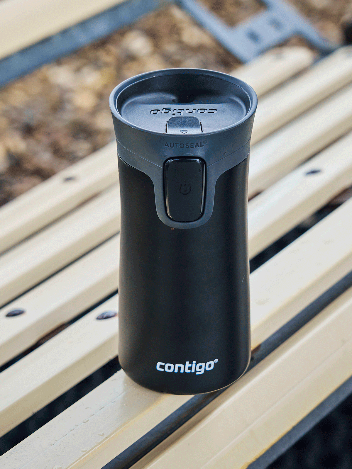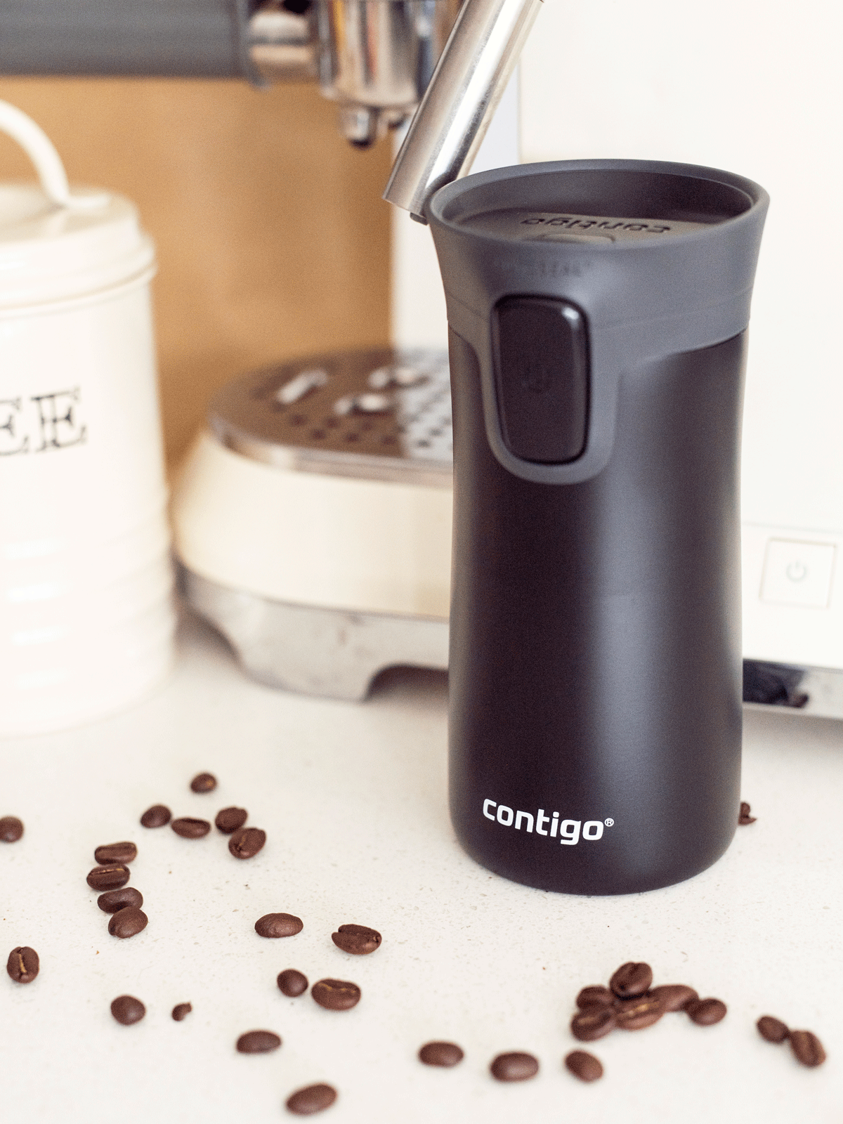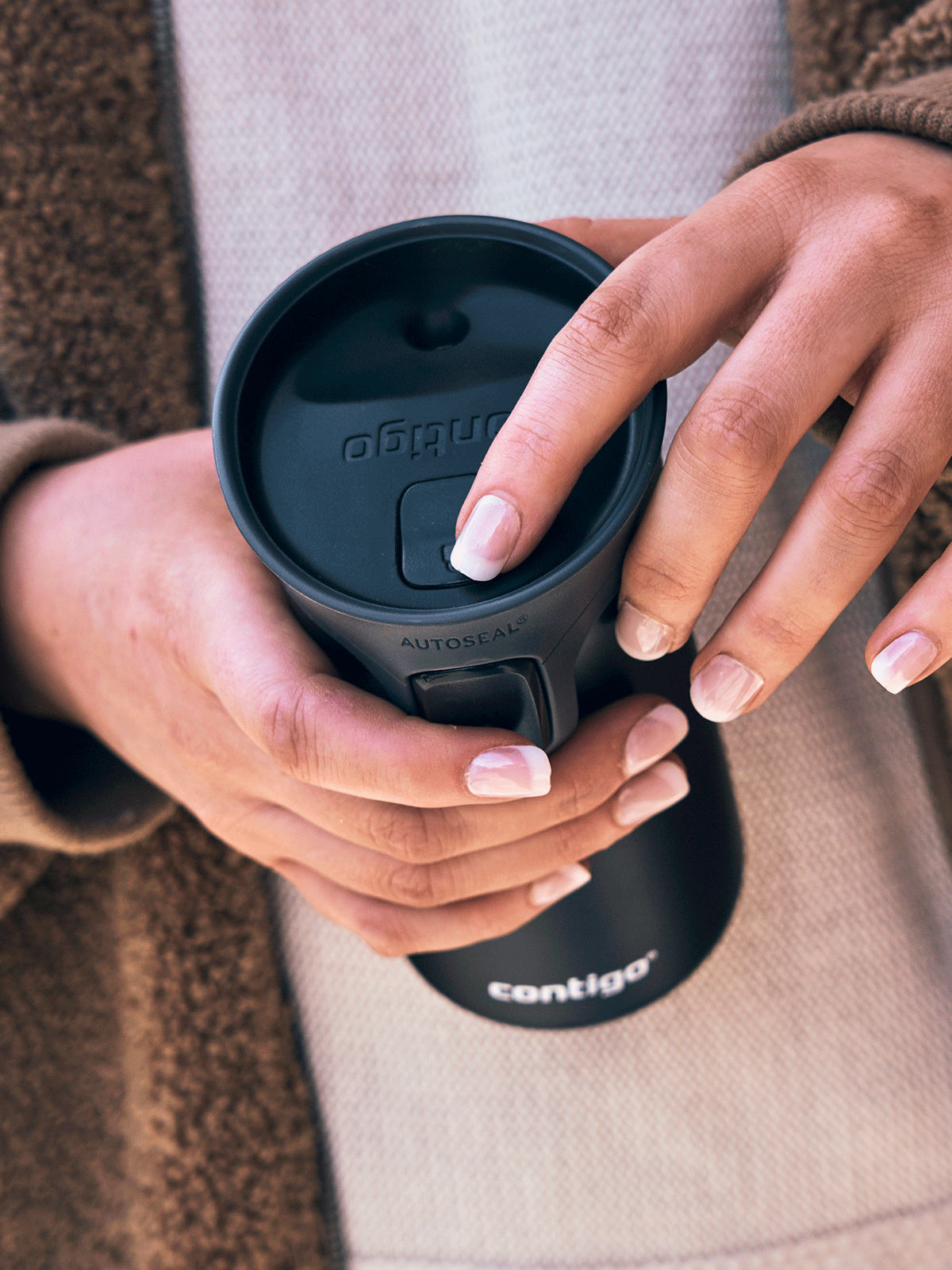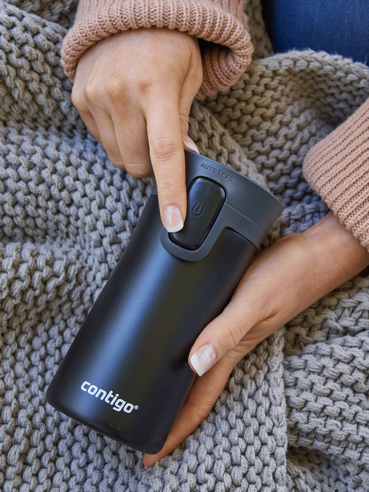 Vous voulez boire le café que vous avez versé dans le mug Contigo Pinnacle? Appuyez sur le bouton AutoSeal situé sur le côté du bouchon et maintenez-le enfoncé, ce qui libère le verrou de l'embout. Relâchez le bouton et le verrou se réenclenchera, protégeant ainsi la boisson contre les fuites. Un bouton de verrouillage supplémentaire situé sur le dessus du bouchon protège le système contre le risque d'ouverture accidentelle dans votre sac ou votre sac à dos. L'ensemble du système de verrouillage peut être facilement actionné d'une seule main, même en conduisant.