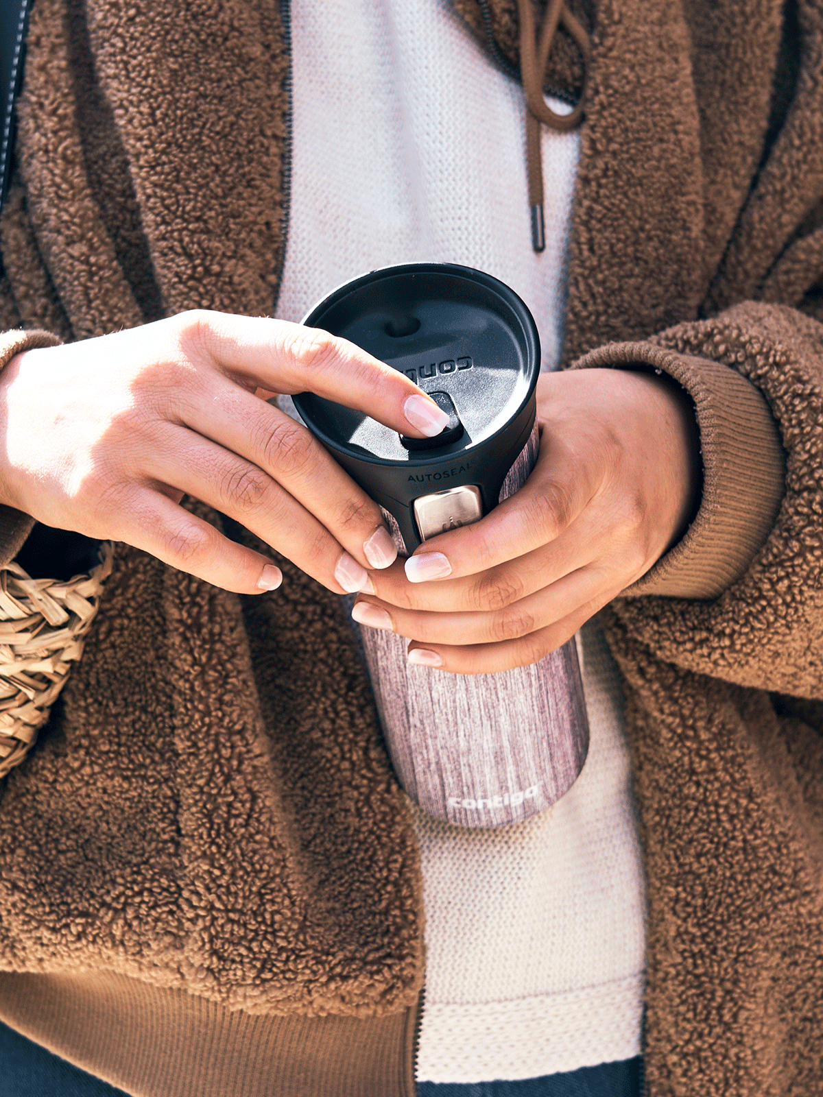 La tapa de la taza térmica Contigo Pinnacle Couture está equipada con el sistema AutoSeal, 100 % hermético y fácil de usar. Un cierre adicional en la parte superior de la tapa proporciona aún más seguridad contra derrames accidentales.